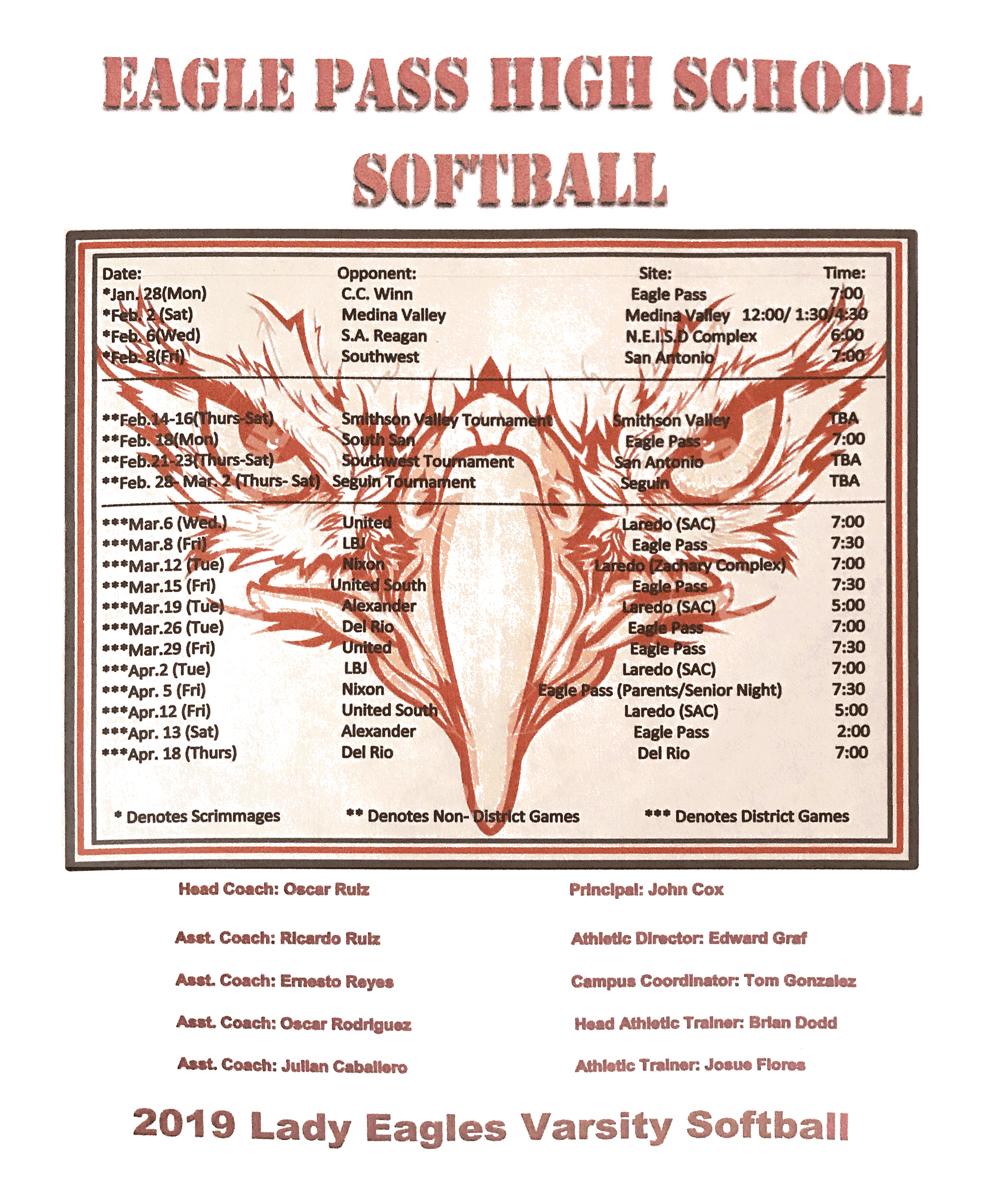 The perennially talent laden and highly touted Eagle Pass Lady Eagles varsity girls’ softball program are armed and ready to inaugurate their 26th season in their storied history which has seen them venture into the post season in 20 out of their previous 25 seasons including a current 16 consecutive year run.